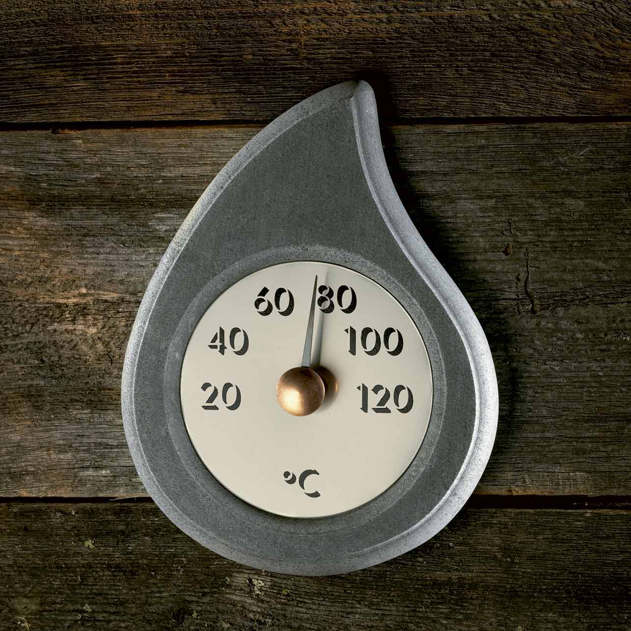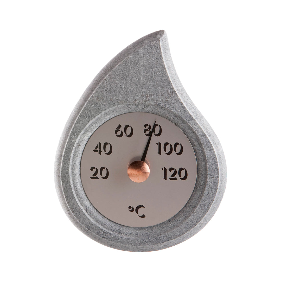Une forme de larme délicate sculptée dans une ancienne stéatite avec un cadran en métal. Pisarainen – un compteur de sauna unique.